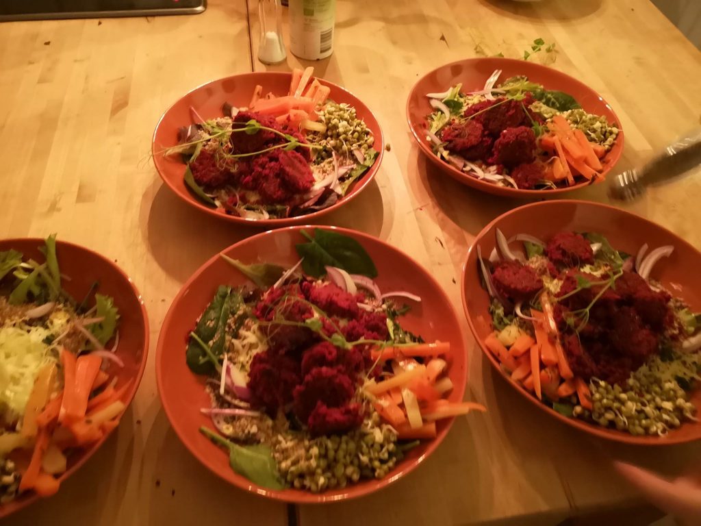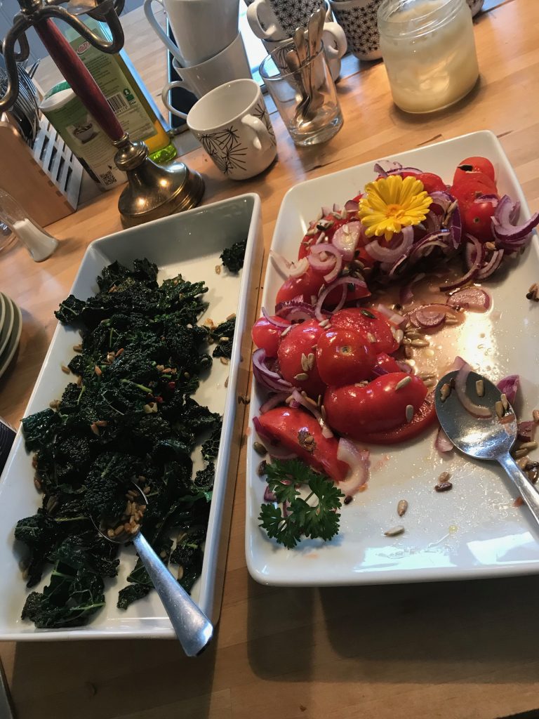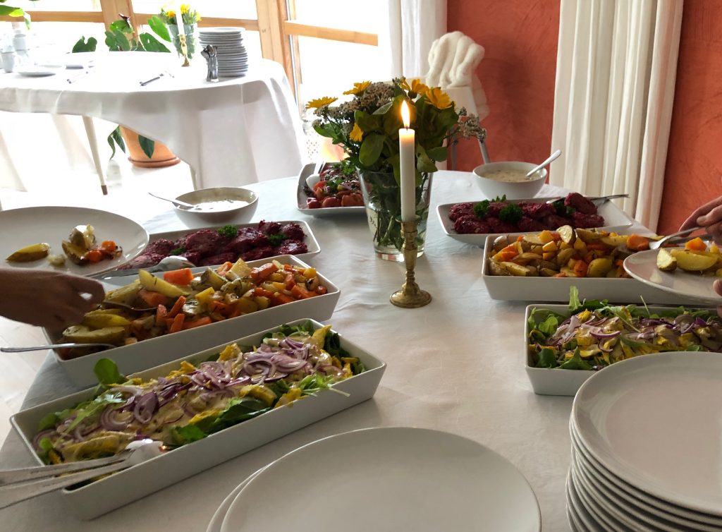Den mat som ingår i retreatavgiften är frukost, lunch, middag samt té och frukt som mellanmål. Egenodlat eller närodlat, ekologiskt och vegetariskt.